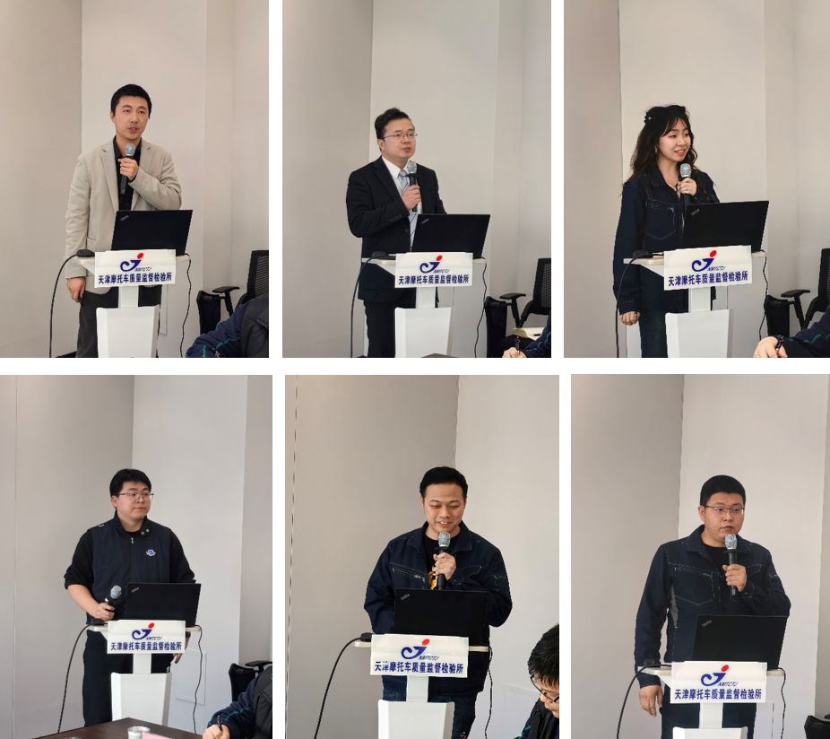而后,摩检所支部陈辰、张松、王建超三位同志依次就“摩托车主客观评价方法与体系建立”“摩托车试验驾驶员技能培养措施与评价方法”“摩托车认证检验性能指标与问题溯源”课题展开汇报。紧接着,设计所支部徐敏、纪永明、王浩权、吕大立四位同志也分别围绕“摩托车智能网联技术研究与测试认证系统开发”“CBF150风冷发动机进气系统优化”“模块化承载式两轮电动摩托车底盘数字化开发”以及“摩托车碰撞试验与数字化仿真技术研究”课题展开汇报。