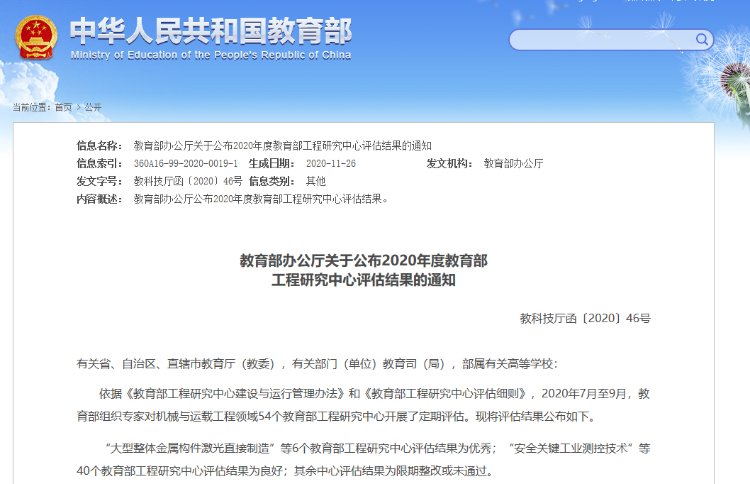 2020年7月至9月期间,教育部组织专家组对机械与运载工程领域参评的54个教育部工程研究中心开展定期评估。评估过程中,专家组对轻型动力工程研究中心在基础理论研究、科研成果转化、行业影响力扩展、国际交流合作、人才培养、产学研合作发展等方面取得的成果给予了高度肯定。最终天津大学轻型动力教育部工程研究中心等6个中心的评估结果为优秀。