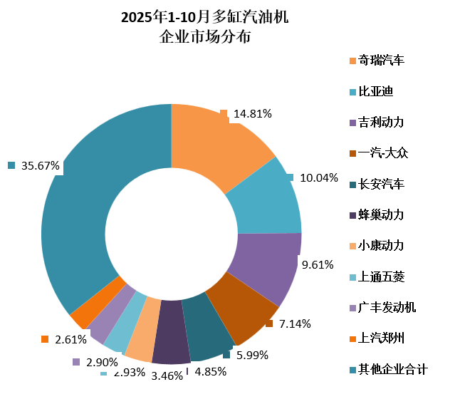 乘用车用在多缸汽油机占比为97.09%,10月销量202.80万台,环比增长-2.51%,同比增长8.41%;1-10月累计销量1717.66万台,同比增长11.25%。奇瑞、比亚迪、吉利、一汽-大众、长安汽车、蜂巢动力、小康动力、上通五菱、广丰发动机、上汽动力郑州销量排在前列。
