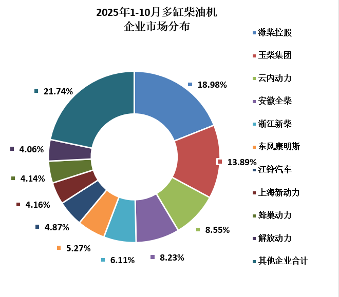 10月,多缸柴油机企业共销量32.08万台,环比增长-7.04%,同比增长15.14%;1-10月累计销量341.67万台,同比增长6.41%。潍柴、玉柴、云内、全柴、新柴、东康、江铃、新动力科技、蜂巢动力、解放动力销量居前十名,占多缸柴油机总销量的78.26%;市场份额占比中:潍柴18.98%、玉柴13.89%、云内8.55%、全柴8.23%、新柴6.11%、东康5.27%、江铃4.87%、新动力科技4.16%、蜂巢动力4.14%、解放动力4.06%。
