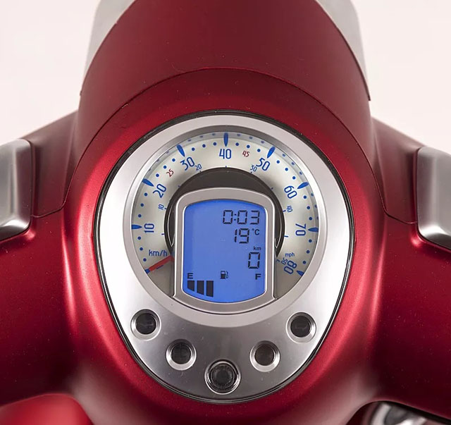 极具复古风格仍兼具科技功能的仪表盘设计,中间镶嵌液晶数字显示屏,信息一目了然。油量、里程、时间、温度、单次里程、电池用量、保养周期提醒等诸多信息智能提示。