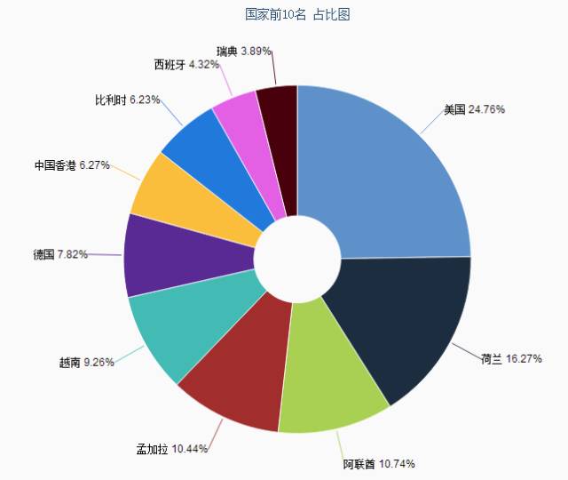 其中出口排名前三位的国家分别为:美国,荷兰,阿联酋。至美国金额约为28,291万美元,占总出口金额的15.57%;