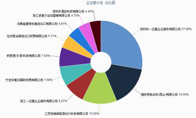 其中出口前三位的企业分别为:深圳市一达通企业服务有限公司,捷安特电动车(昆山)有限公司,江苏拓驰新能源动力科技有限公司。