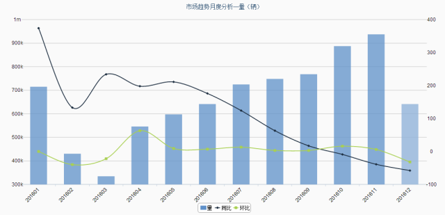 月度出口量同比下跌最大的月份是2016年12月,641,353辆,同比幅度-58%;同比上涨最大的月份是2016年1月,714,915辆,同比幅度374%。
