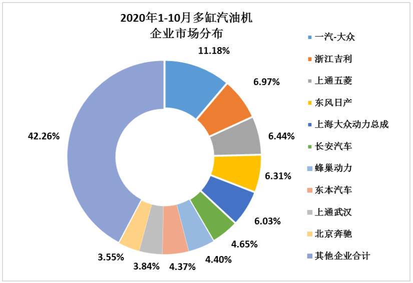 多缸汽油机主要配套的乘用车市场10月产销持续回升,受其影响,多缸汽油机销量环比、同比小幅增长,累计同比降幅继续收窄。10月销售196.55万台,环比增长0.79%,同比增长6.03%;1-10月累计销量1463.80万台,同比增长-5.26%。在55家多缸汽油机企业中一汽大众、浙江吉利、上通五菱等十家销量排在前列,其总体销量占行业销量的57.74%。乘用车用在多缸汽油机占比为96.59%,10月销售190.59万台,环比增长0.76%,同比增长5.45%;1-10月累计销量1413.87万台,同比增长-6.27%。企业的累计销量仍延续上月好转态势,同比增长率由负转正越来越多。