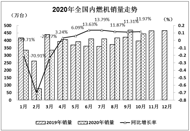 10月,汽车、工程机械、农业机械等终端市场增速仍延续上月高位增长态势,受其影响,当月内燃机销量较上月虽有小幅回落,但同比仍延续了4月以来的增长趋势,累计销量降幅继续收窄。