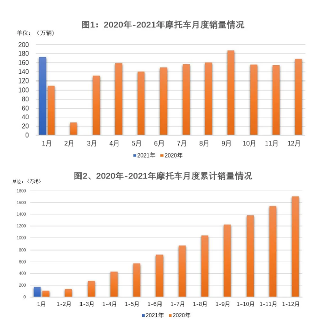 1月,全行业完成摩托车产销171.3万辆和172.77万辆,产量环比增长1.47%,销量环比增长2.56%,同比增长57.18%和58.72%。