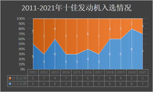 与去年评选结果相比,本年度自主品牌发动机入选数量减少1款,合资品牌相应增加1款。不过从近10年十佳发动机的评选结果来看,自主品牌发动机的入选数量整体呈逐年增加趋势,直至本年度评选依然保持对合资品牌的领先优势。