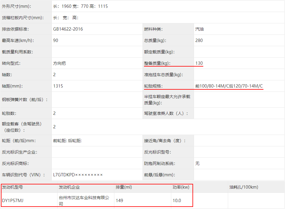 动力系统来自台州汉达车业,排量149cc最大功率10kW,整备质量130kg,轮胎规格100/80-14、120/70-14。