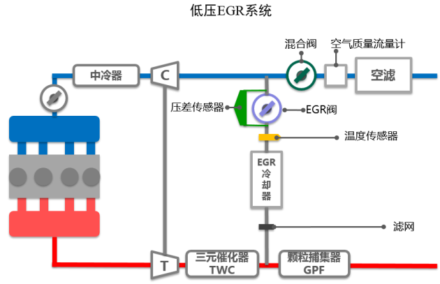 GC20TD混动发动机自主开发了低压冷却废气再循环(简称EGR)技术,配合深度米勒循环、电动水泵等技术,实现23%EGR率,突破行业难题,有效提升热效率。