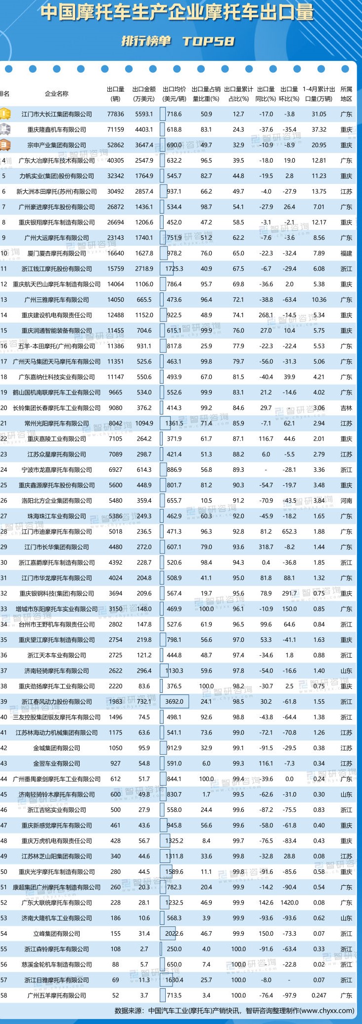 就出口量同比而言,39家车企摩托车出口量呈下降趋势,其中同比降幅最大的是济南大隆机车工业有限公司,同比下降了93.64%,6家车企出口量同比增幅超过100%,其中同比增幅最大的是江门市长华集团有限公司;与3月相比,17家车企出口量有所增长,增长幅度最大的是广东大联统摩托车有限公司,出口量由3月的15辆增长至4月的228辆,环比降幅最大的是top58,下降了97.85%;58家车企中广东和重庆出口量均超过24万辆,江苏7家车企总出口量大于有12家企业上榜的浙江。