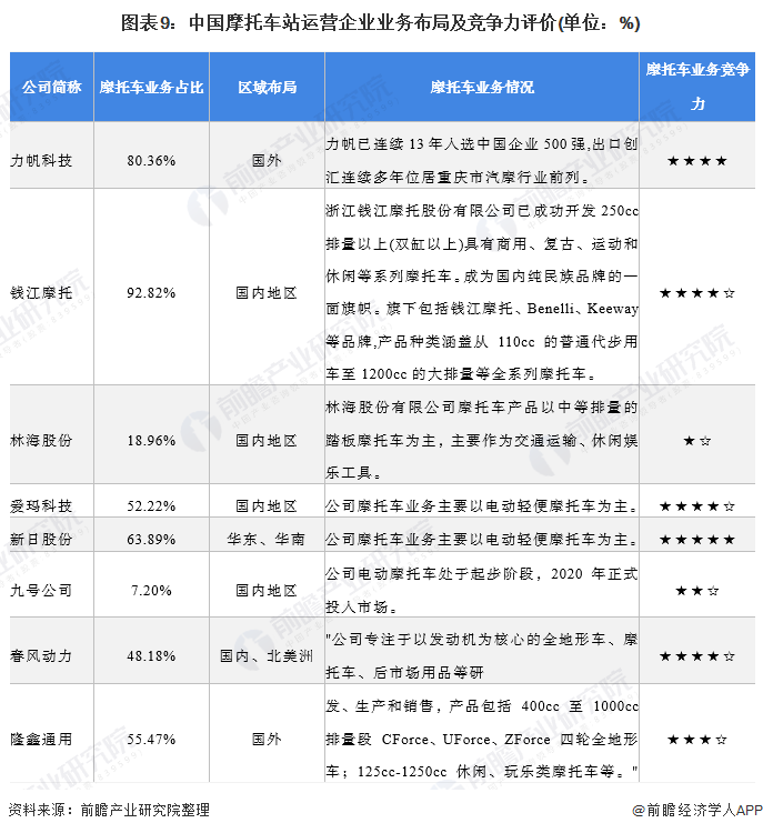 从企业摩托车业务的竞争力来看,除了力帆集团、隆鑫通用和钱江摩托等传统燃油车业务竞争力较强以外,以电动轻便摩托车为主营业务的爱玛和新日股份也有较强的竞争力。