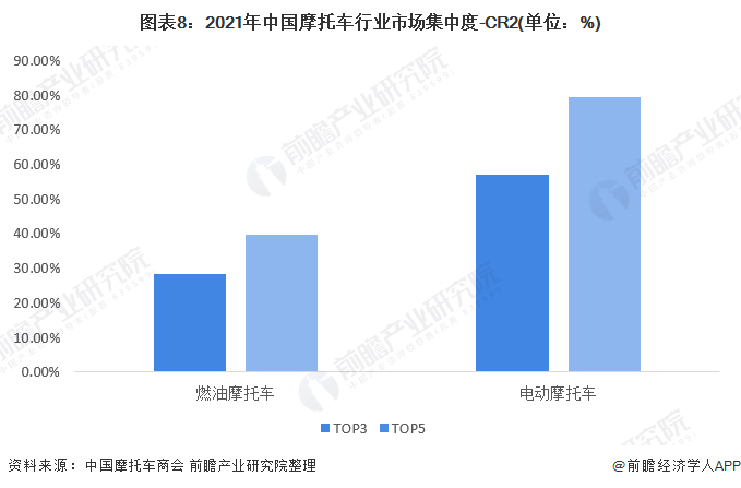 从市场集中度来看,电动摩托车行业市场集中度明显高于燃油摩托车行业。2021年我国电动摩托车CR3市场占比达56.91%,CR5是市场占比达79.34%,而燃油摩托车CR3市占率不足30%,CR5市占率不足40%。