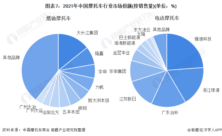 对比两种摩托车品牌竞争格局来看,我国燃油摩托车市场知名品牌主要有大长江集团、隆鑫集团、宗申集团和力帆集团。电动摩托车市场知名品牌则有雅迪、绿源、台铃和新日等。