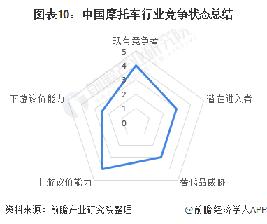 从五力竞争模型角度分析,随着新能源技术的发展,公共交通的普及,摩托车面临的替代品威胁较大;行业现有竞争者数量较多,且市场份额,尤其是燃油摩托车市场份额较为分散;上游供应商则为一般原材料制造商、精密零件制造商和轮胎制造商等企业,这些行业均已较为成熟,且应用的下游领域较广,因此对摩托车行业议价能力较强,而下游消费市场主要以三四线城市通行需求和发达地区的高端消费需求为主,且前者占比较大,因此下游议价能力一般;目前行业存在较高的准入资质以及资金、技术门槛较高,潜在进入者威胁较小,但由于电动摩托车的发展以及三四线城市存在的刚性消费需求,因此行业仍具有较大的发展潜力,吸引着大量潜在进入者进入。