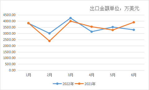 与2021年相比,除5月份外,其他5个月均低于去年同期。分月走势与国内市场有相同之处,3月份拉升幅度很大,形势喜人。3月下旬至4月的物流不畅影响货柜出海,出口量被拉入低谷。