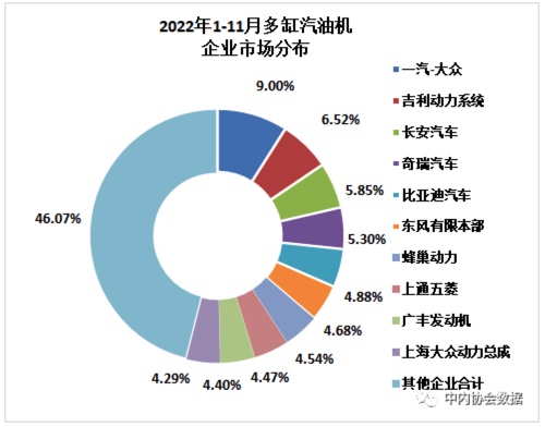 11月多缸汽油机销量162.08万台,环比增长-9.22%,同比增长-17.77%;1-11月累计销量1722.86万台,同比增长1.26%。在51家多缸汽油机企业中一汽大众、吉利、长安汽车、奇瑞、东风有限等十家销量排在前列,其总体销量占行业销量的53.93%。
