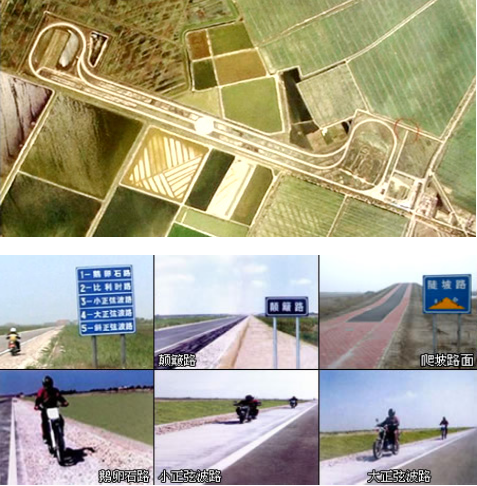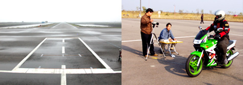 The lanes for testing performances, 1870m long and 9m wide, are used for max speed, starting acceleration, overtaking acceleration and fuel consumption at constant speed test, etc. A 200m long and 7m wide high μ-form road is used for braking test. On one side of the lanes are special sections of jerky road 800m in length and 1.5m in width, Belgium road 100m in length & 1.5m in width, cobbled road, large and small oblique Sine-shaped roads, etc. On the remote end of lanes is a steep slope testing area with 4°and 10°slopes for testing the assembly quality, steering and damping systems, climbing capacity as well as operability, comfortability and passability of tested motorcycles.