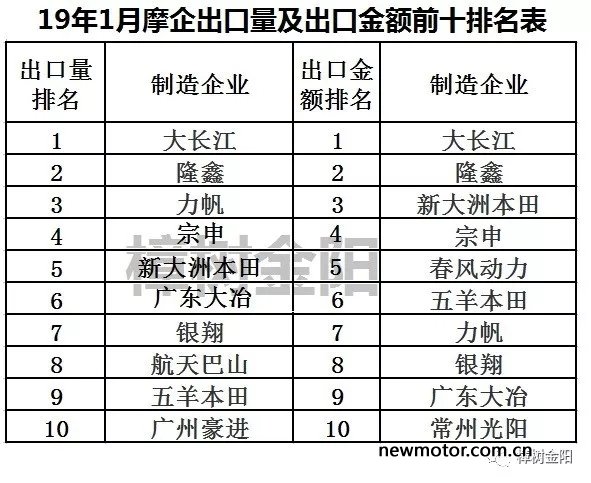 2019年1月,摩托车出口量排名前十位的企业依次为:大长江、隆鑫、力帆、宗申、新大洲本田、广东大冶、银翔、航天巴山、五羊-本田和广州豪进。与上年同期相比,广东大冶、大长江和银翔出口量均呈两位数增长,隆鑫增速略低,其他六家企业均呈下降,航天巴山和力帆降幅居前。1月,上述十家企业共出口40.26万辆,占摩托车出口总量的62.49%。