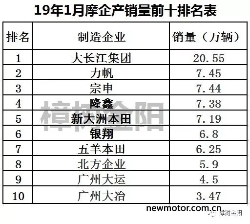 2019年1月,摩托车销售前十名企业(集团)为大长江、力帆、宗申、隆鑫、新大洲本田、银翔、五羊-本田、北方企业、广州大运和广东大冶,分别销售20.55万辆、7.45万辆、7.44万辆、7.38万辆、7.19万辆、6.8万辆、6.25万辆、5.9万辆、4.5万辆和3.47万辆。与上年同期相比,除广东大冶销售量增长外,其他9家企业均呈不同程度下降。1月,上述十家企业累计销售76.93万辆,约占摩托车总销量的65.62%。