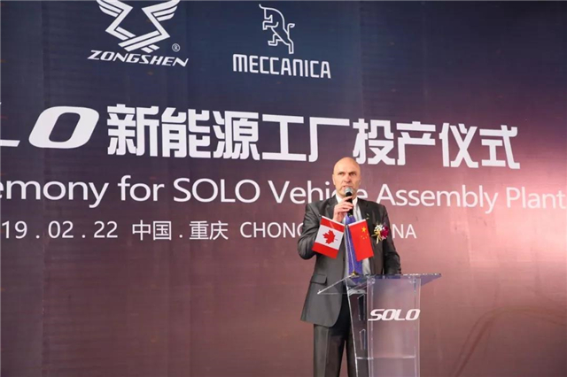 为了响应国家让民企“走出去”的战略和企业战略转型,大力发展新能源交通工具的发展战略,宗申产业集团旗下宗申机车在2017年3月与加拿大EMV公司签订合作协议,决定共同研发、制造、销售三轮、四轮电动高端城市通勤车。历时两年,万众期待,双方合作的第一款SOLO能源新型单人城市通勤车正式投产。
