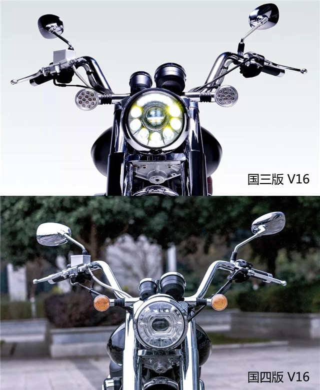 在国三版V16美式巡航设计的基础上,国四版V16的大灯依旧采用LED灯组,对灯光设计与灯组排列做了改进。