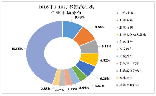 主要是受乘用车市场销售持续走软影响,多缸汽油机10月销量环比、同比双降,累计销量降幅有所增大。10月,销售176.02万台,环比下降3.84%,同比下降15.55%,1-10月销量1782.89万台,同比下降3.24%,。一汽大众、上通五菱、浙江吉利等十家销量排在前列,其总体销量占行业销量半壁江山,达到54.45%。吉利、东风日产、奇瑞、上海大众销量同比增幅较为明显,涨幅在14%-49%,其中吉利(48.88%)、上海大众(14.16%)增长较为突出。其中乘用车用占比98.48%,10月销售173.68万台,环比下降3.89%,同比下降15.53%;累计销量1755.79万台,累计同比下降2.25%,比上月增加1.7个百分点。