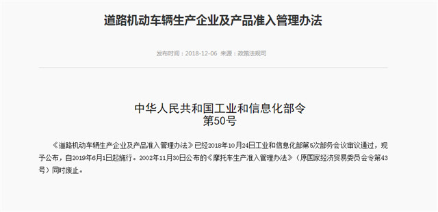 近日,由工信部政策法规司起草的《道路机动车辆生产企业及产品准入管理办法》(以下简称为《办法》),已经由2018年10月24日工业和信息化部第5次部务会议审议通过,《办法》将于2019年6月1日起施行。