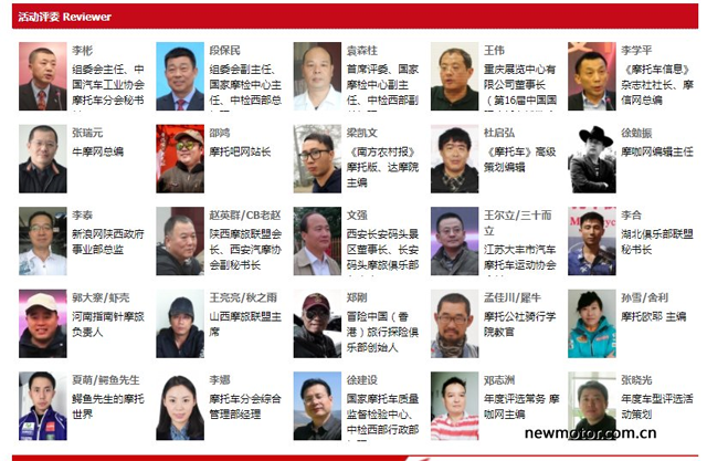 今年,摩咖网、摩托吧、摩信网、牛摩网、达摩院、《摩托车》、摩托欧耶、摩托世界以及陕西摩旅联盟、西安长安码头机车俱乐部、江苏大丰汽摩协会、湖北摩旅联盟、河南指南针摩托旅、山西摩旅联盟等倾情支持。评委囊括了摩托车分会、中检西部(国家摩检中心)、各媒体俱乐部的负责人,评审团在摩托车行业堪称最强大的阵容。