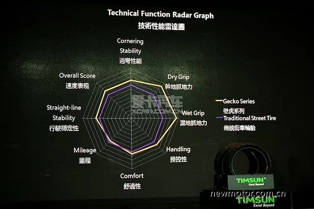 从这张雷达图中可以清晰的看出,腾森轮胎在湿地抓地力方面有着十分出色的表现,据介绍,“壁虎”系列轮胎的湿地刹车距离要比普通轮胎短35%。