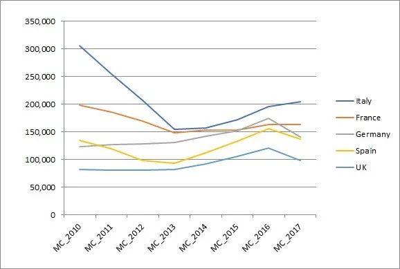 值得注意的是,法国和意大利市场,目前销量还没接近金融危机前的水平。实际上,两个国家的2017年摩托车销量仍远低于2010年的水平,而英国的销量远高于金融危机前的水平。