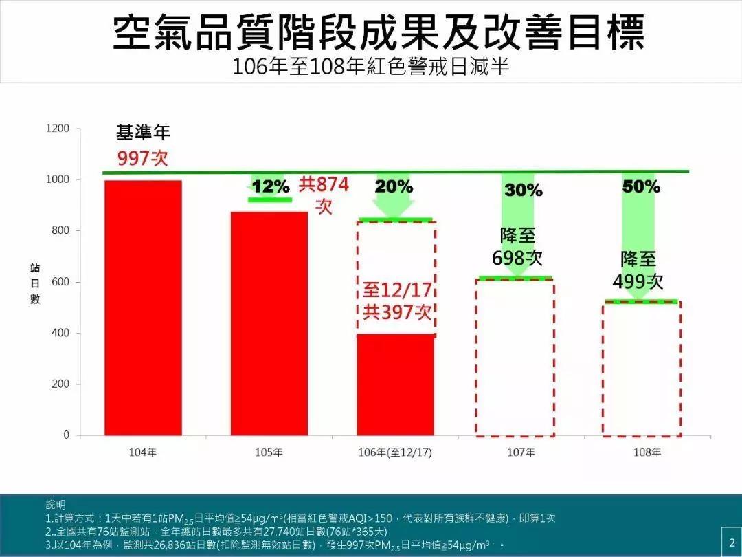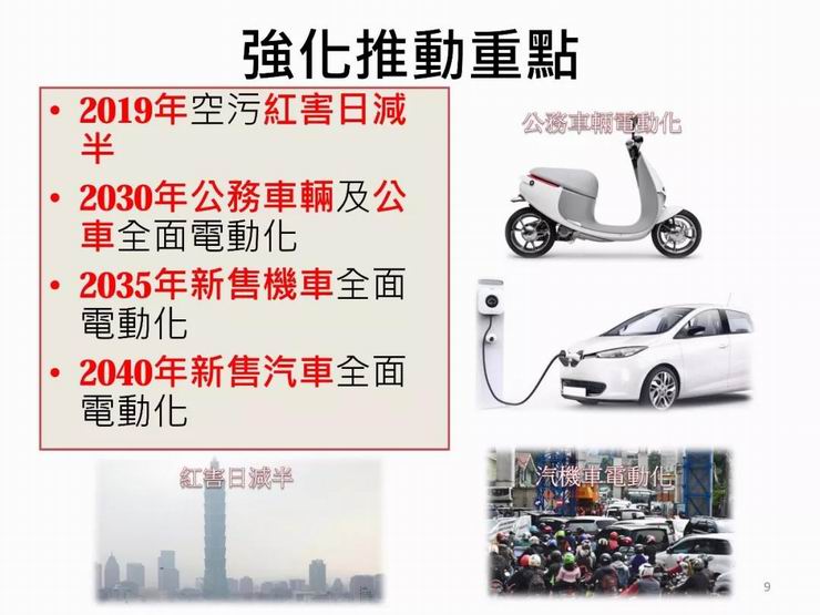 台湾当局将通过国营事业超低排放、加速老旧车辆淘汰、加强餐饮业油烟、建筑工程及河道扬尘管理等,预期可达成2019年空气红害日减半、2030年公务车辆全面电动化、2035年机车全面电动化、2040年汽车全面电动化等目标,以“更全面、更具体、更给力”的方式持续改善空气污染。