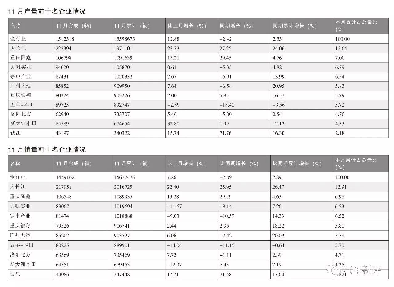 11月,摩托车销售前十名企业(集团)为大长江、隆鑫、力帆、广州大运、宗申、五羊-本田、银翔、新大洲本田、北方企业和钱江,分别销售21.8万辆、10.65万辆、8.91万辆、8.52万辆、8.15万辆、8.02万辆、7.95万辆、6.46万辆、6.36万辆和4.31万辆。与上月相比,6家企业销售量增长,4家下降;与上年同期相比,5家增长,5家下降。11月,上述十家企业累计销售91.12万辆,占摩托车总销量的62.45%。
