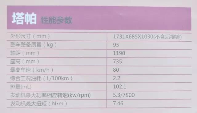 虽然是一款面对都市丽人的专属小踏板,但塔帕100的配置并不寒酸。其搭载了智能电喷发动机,最大功率为5.3千瓦,最大扭矩为7.46牛米。