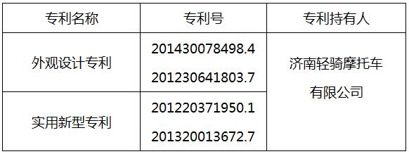 一、QM48QT-8E(铃鹿)是济南轻骑专利产品,任何企业和个人均无权擅自仿造。济南轻骑将对涉嫌侵犯本公司专利的生产企业依法采取维权措施。