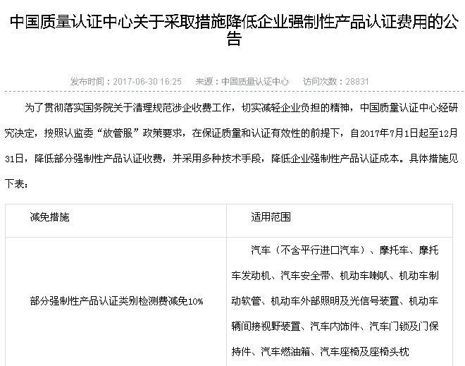 6月30日,为了贯彻落实国务院关于清理规范涉企收费工作,切实减轻企业负担的精神,中国质量认证中心经研究决定,自2017年7月1日起至12月31日,降低部分强制性产品认证收费,并采用多种技术手段,降低企业强制性产品认证成本。