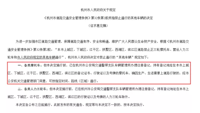 5月12日,杭州市公安局官网发布了一条关于规定< 杭州市道路交通安全管理条例>第32条第2款所指禁止通行的其他车辆的决定》意见的公告,意味着杭州市区将实行新的禁摩政策,现向社会公开征求意见和建议。