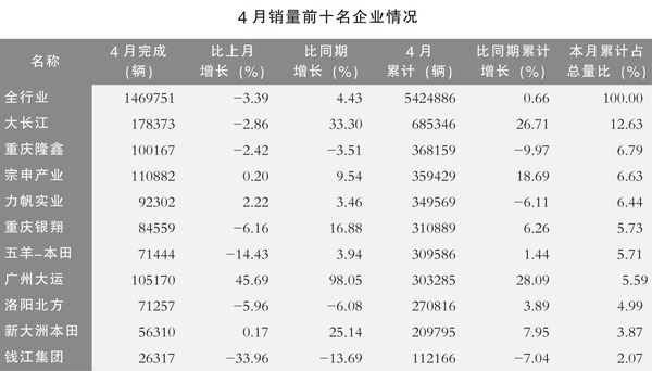 1~4月,摩托车销量排名位居前十名企业(集团)为:大长江、隆鑫、宗申、力帆、银翔、五羊-本田、广州大运、北方企业、新大洲本田和钱江,分别销售68.53万辆、36.82万辆、35.94万辆、34.96万辆、31.09万辆、30.96万辆、30.33万辆、27.08万辆、20.98万辆和11.22万辆。