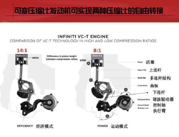 这款可变压缩比发动机,也叫VC-Turbo发动机,是全球收款可以根据驾驶需求,切换性能和最佳油耗的发动机,压缩比能够在8:1和14:1之间切换。因为应用“可变压缩比”技术,燃油经济性相比同级别发动机提升了27%。