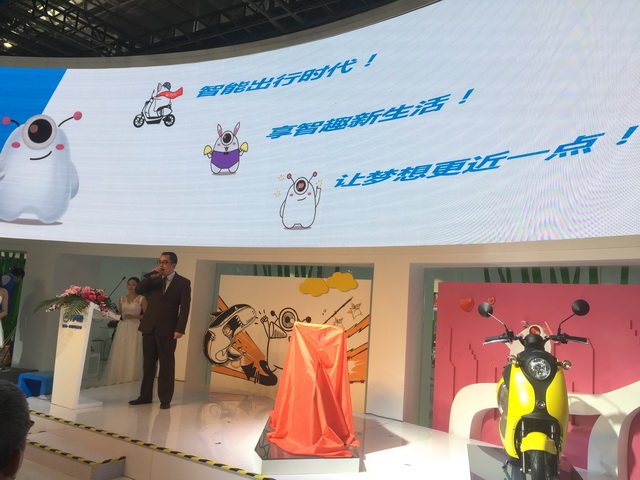 五羊-本田摩托(广州)有限公司常务董事、总经理藤阪之敏先生和五羊-本田常务董事、常务副总经理赖博轶先生等一同主持概念电动车EB-X揭幕仪式。