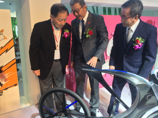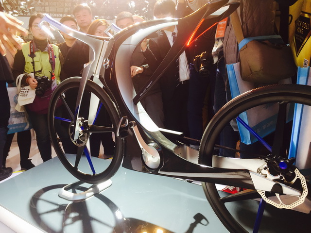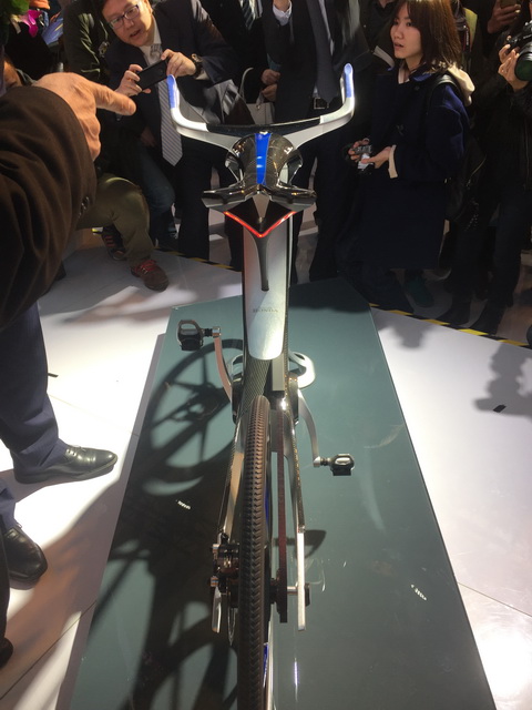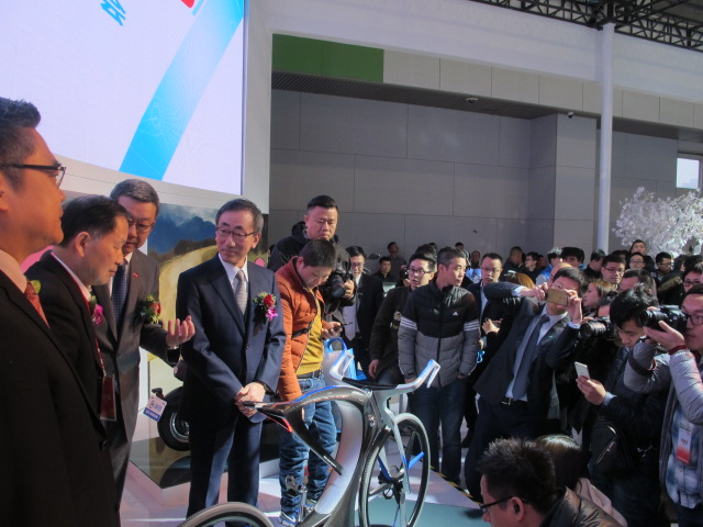 黑科技满满的电动自行车概念车亮相,被参展者围得水泄不通,想想小编我1米5的身高,头顶那是乌泱泱一片啊。五羊-本田各高层领导也都在现场对这款新品进行了讨论,日语我虽听不懂,但吃瓜群众听来无非就是“赞”声一片。