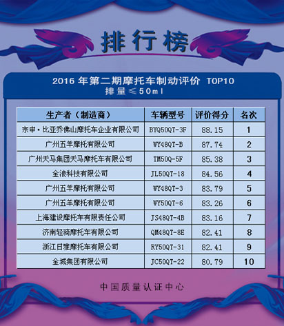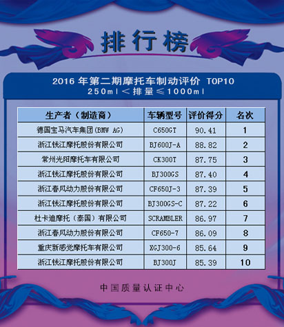 中国质量认证中心(CQC)、中国汽车工业协会摩托车分会(CAAM Motorcycle)和天津摩托车技术中心(TMTC)根据《机动车系统评价规则 两轮摩托车制动性能》的规定,将2016年第二期两轮摩托车制动性能系统评价TOP10,予以公告。