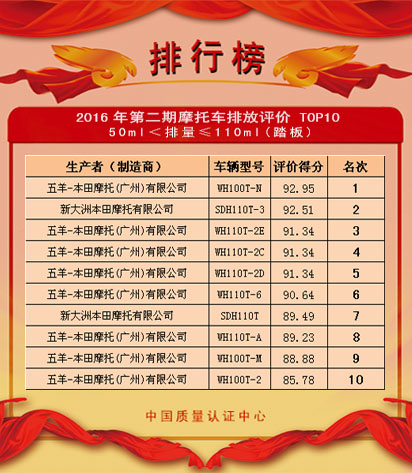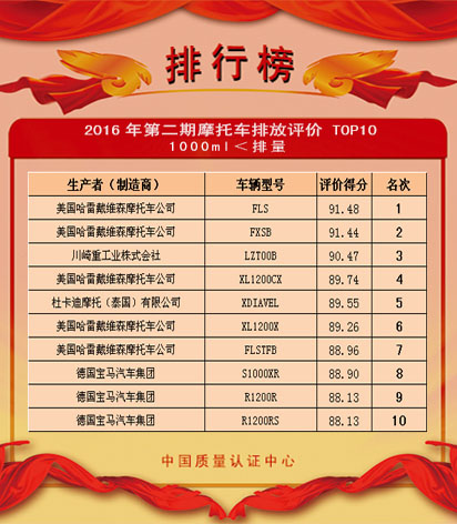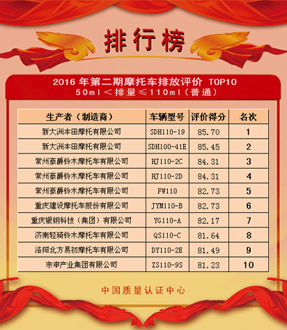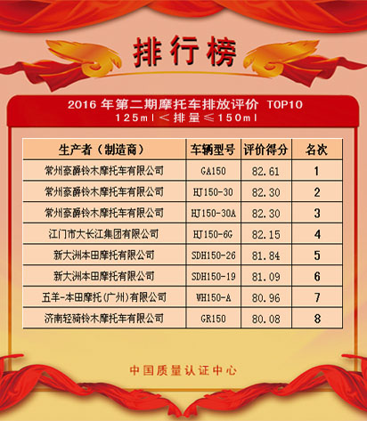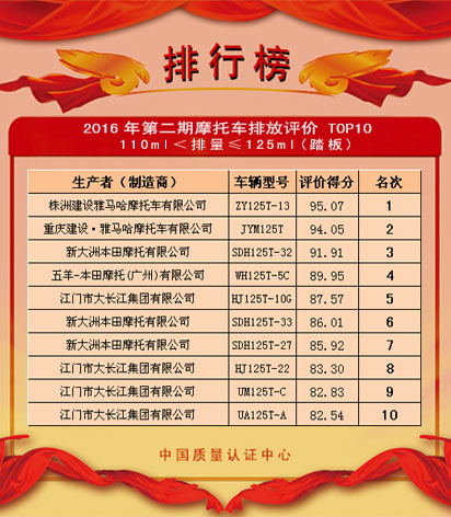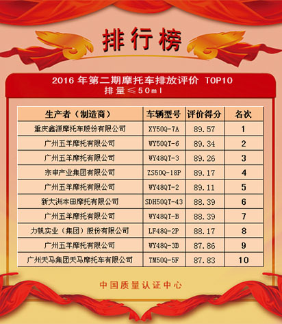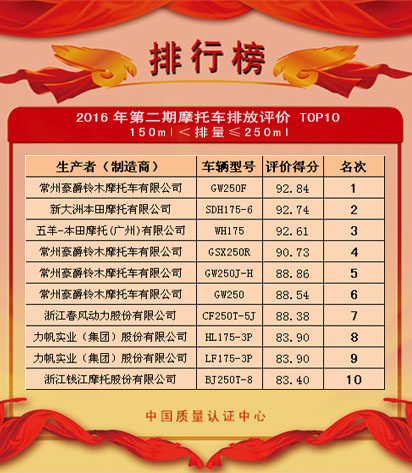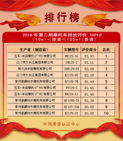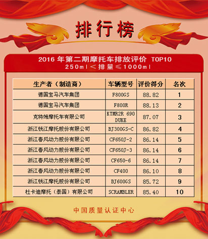 中国质量认证中心(CQC)、中国汽车工业协会摩托车分会(CAAM Motorcycle)和天津摩托车技术中心(TMTC)根据《机动车系统评价规则 两轮摩托车排放性能》的规定,将2016年第二期两轮摩托车排放性能系统评价TOP10,予以公告。
