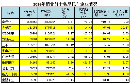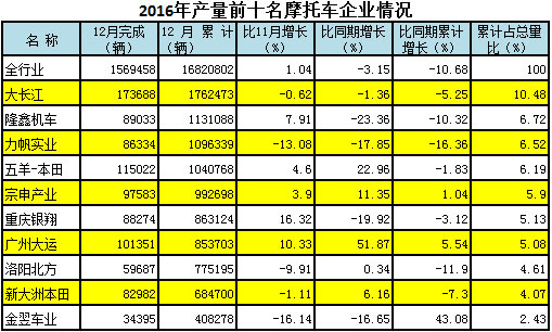 2016年1~12月,摩托车销售前十名企业(集团)为大长江、隆鑫、力帆、五羊-本田、宗申、银翔、广州大运、北方企业、新大洲本田和金翌车业,分别销售177.57万辆、113.07万辆、103.09万辆、102.13万辆、98.82万辆、85.31万辆、85.12万辆、77.78万辆、71.92万辆和40.83万辆。2016年,上述十家企业累计销售955.63万辆,占摩托车总销量的56.88%,比上年同期提升3.6个百分点,企业生产集中度有所提升。
