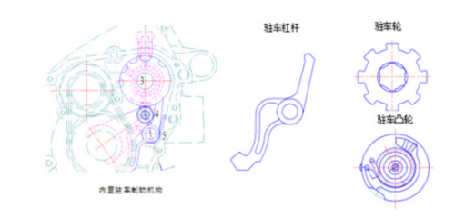 发动机内置驻车制动机构,在变速器主轴上周向固定一个圆周均布有多个矩形齿用于驻车的驻车轮,轴上设有制动杠杆的复位扭簧和省力的驻车凸轮。它内置于发动机内部,通过换挡机构控制制动,既有极强的安全可靠性,又操作简单方便。