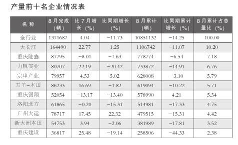 1~8月,摩托车销售前十名企业(集团)为大长江、隆鑫、力帆、宗申、五羊-本田、银翔、北方企业、广州大运、新大洲本田和建设股份,分别销售107.89万辆、77.87万辆、69.1万辆、62.86万辆、60.38万辆、55.41万辆、52.16万辆、47.92万辆、43.31万辆和26.76万辆。与上年同期相比,10家企业销售量均呈不同程度下降,其中建设股份降幅显著。1~8月,上述十家企业累计销售603.64万辆,占摩托车总销量的55.75%,比上年同期提升0.91个百分点。