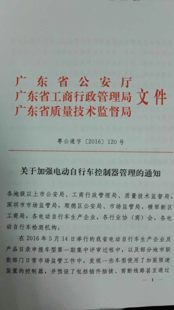 据笔者了解,近日,由广东省公安厅、广东省工商行政管理局和广东省质量技术监督局三部门联合发出红头文件《关于加强电动自行车控制器管理的通告》(以下简称《通告》)。