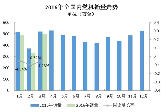 2016年3月,除乘用车用、商用车用内燃机同比增长外,其余行业均有不同程度下降,销售总量稳中略有下降。