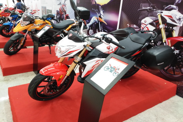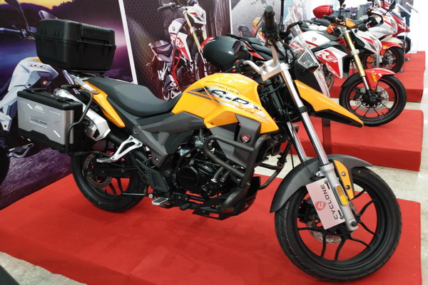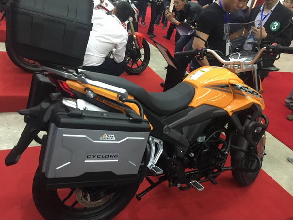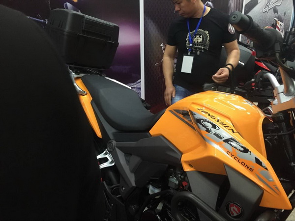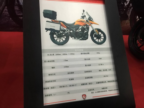 4月12日,宗申机车在重庆国际博览中心举行了,以"创 新势界"为主题的品牌战略及新品全球发布会。牛摩网记者也应邀前往会议现场参与报道,会场现场记者注意到了一台宗申预计今年上市的RX1实车,该车是一款150cc的拉力车,外形与RX3有较大相似性,带边箱及尾箱,以下为图片现场实车拍摄: