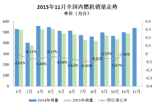 根据中国内燃机工业协会《中国内燃机工业销售月报》重点企业数据显示,2015年11月完成内燃机销量[ 包含110家内燃机整机企业及摩托车发动机数据]486.29万台,环比增长11.32%,同比下降2.54%;1-11月销量累计完成5179.69万台,同比累计下降5.42%;11月完成20801.8万千瓦,环比增长14.14%,同比增长14.54%,1-11月累计完成192320.65万千瓦,同比累计增长0.45%。乘用车市场销量快速上升,累计销量远好于行业平均水平,同比累计增长6.25%;受国2升国3影响,柴油机市场仍在低位徘徊,同比累计降幅扩大到17.58%。